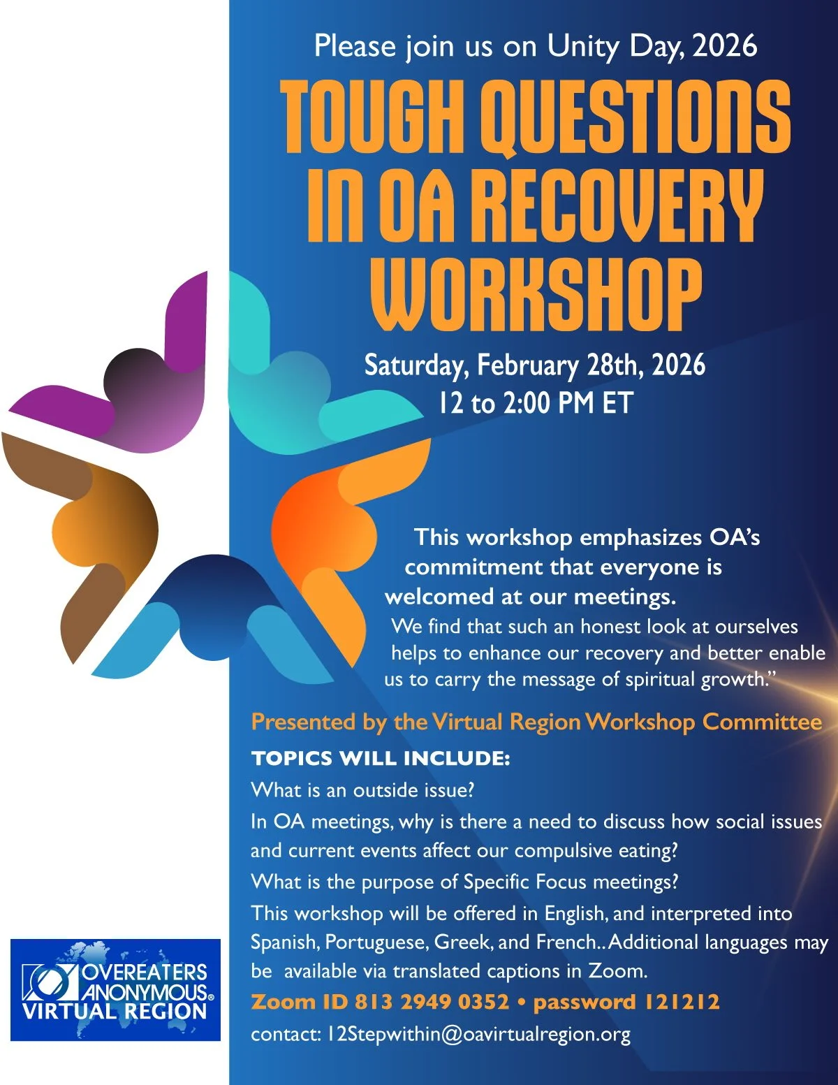 This workshop is offered by OA San Diego Intergroup’s Twelfth Step Within Committee. No registration or fees. The 7th tradition will be observed. All are welcome! Questions? Please contact Elyesse at tsw@oasandiego.org.